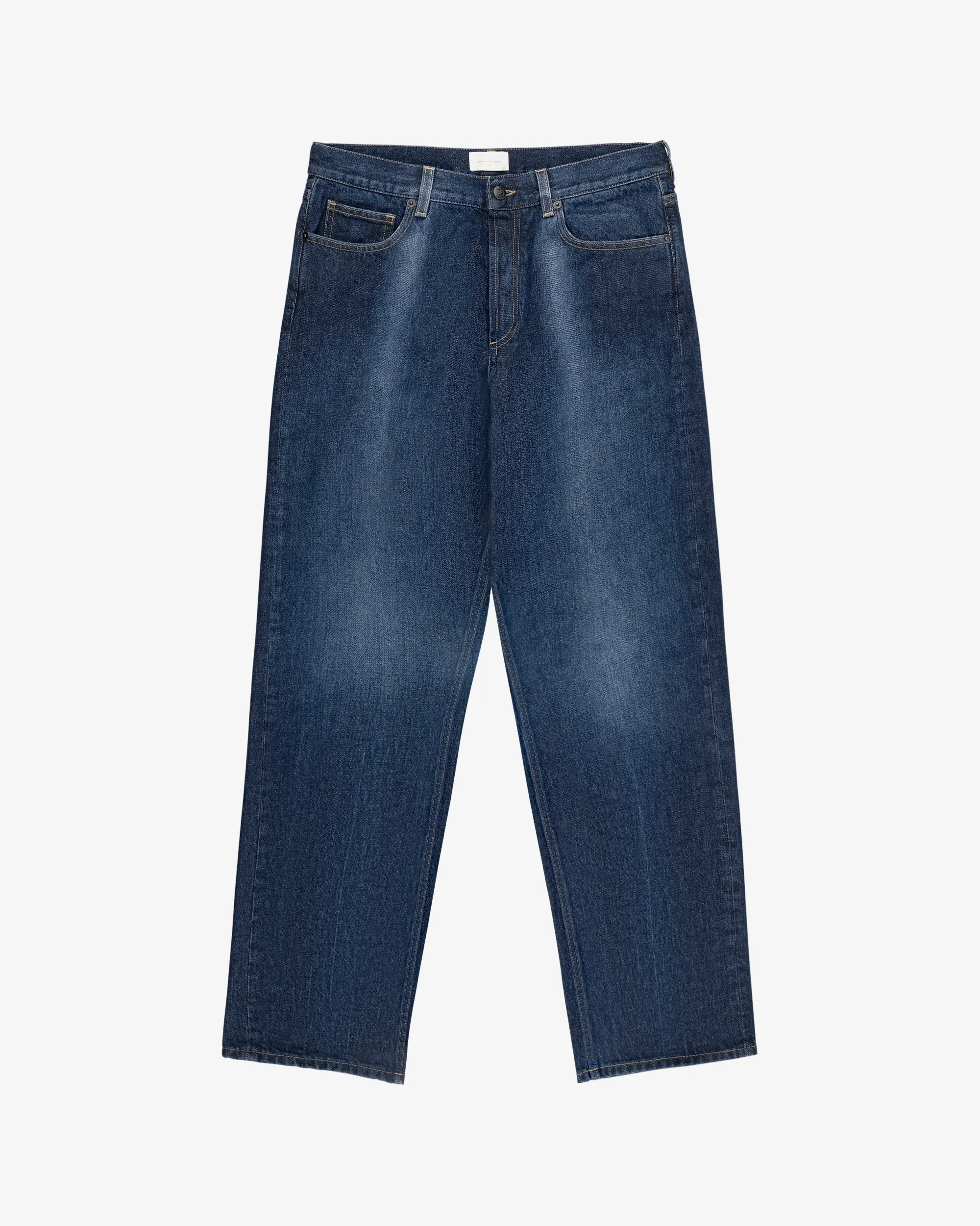 - • Blue denim pants• Cowboy crease at front legs• Leather patch with debossed logo at back waistband• Straight fit• Button closure with shank fly• Two hand pockets at front• One coin pocket at front• Two patch pockets at back• 100% Cotton• Hand wash• Made in China