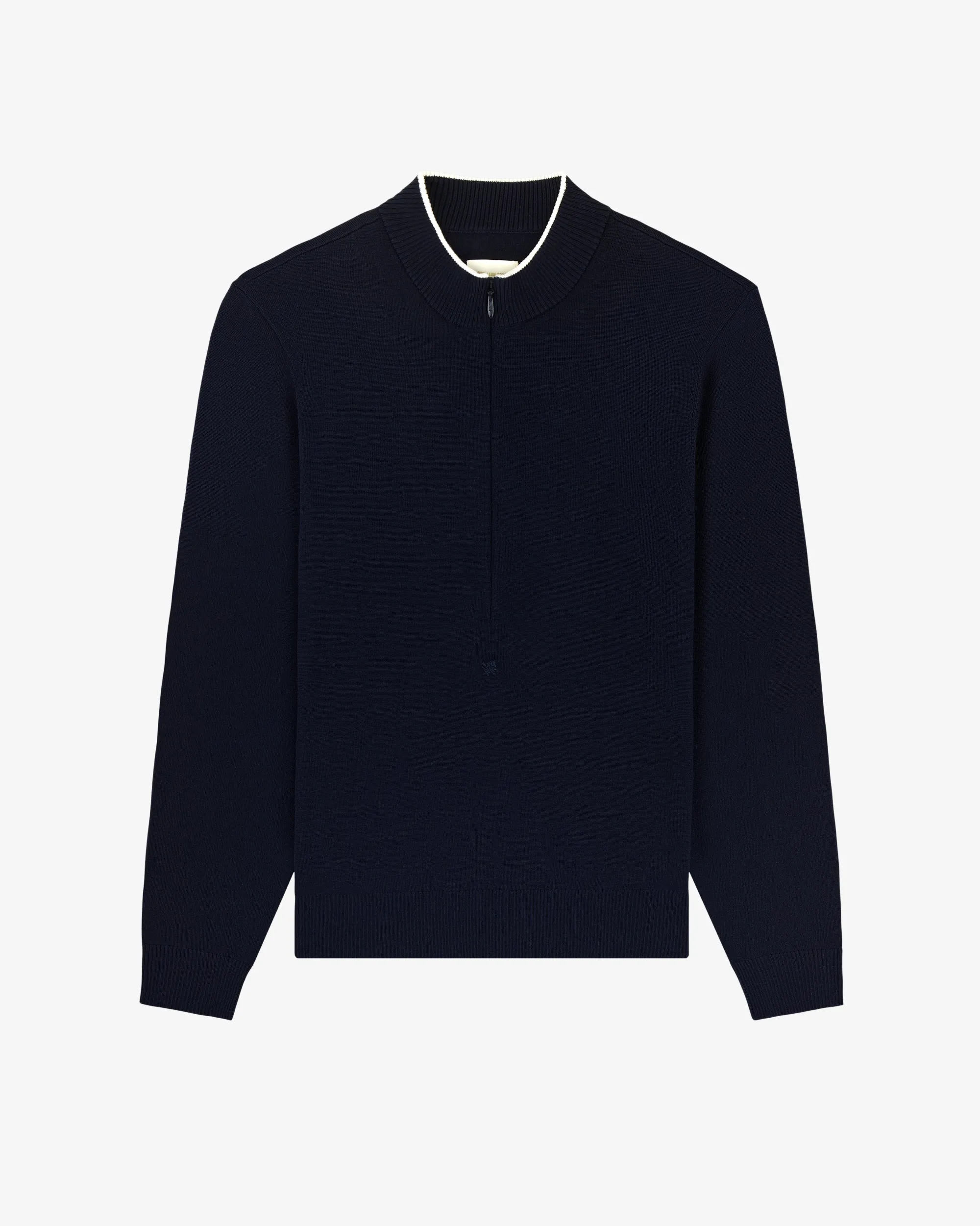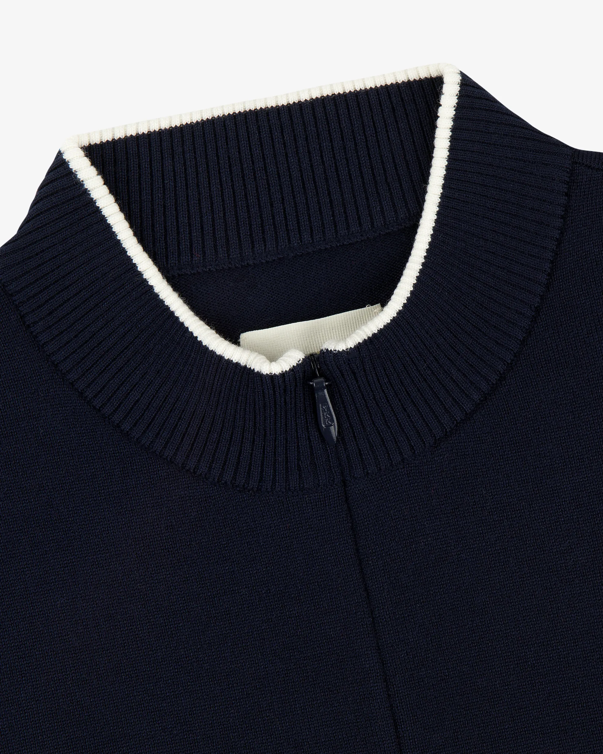 - • Navy cardigan• Merino wool jersey fabric• Embroidered Queens crest at front• Contrast stripe at collar• Regular fit• Concealed half zip closure at front• Ribbed collar, cuffs, & hem• 100% Merino Wool• Dry clean only• Made in China
