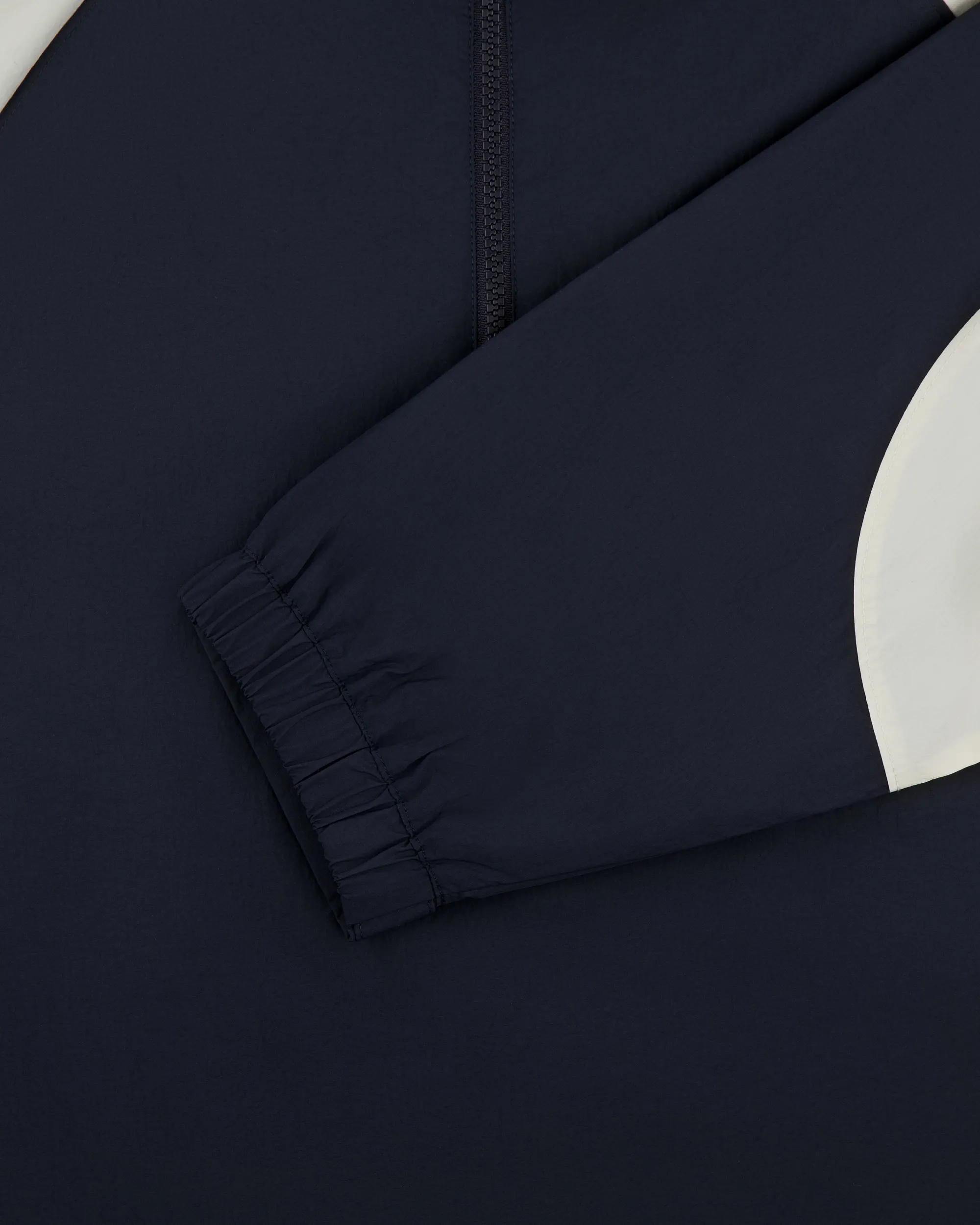 - • Navy & cream pullover jacket• Nylon fabric• Embroidered Queens crest at front & back• Contrast undercollar• Half elasticated sleeve cuffs with velcro straps• Bungee with cord locks at interior hem• Regular fit• Half zip closure at front• Two hand pockets at side seams• Lined• Body: 100% Nylon• Lining: 100% Polyester• Machine wash• Made in China