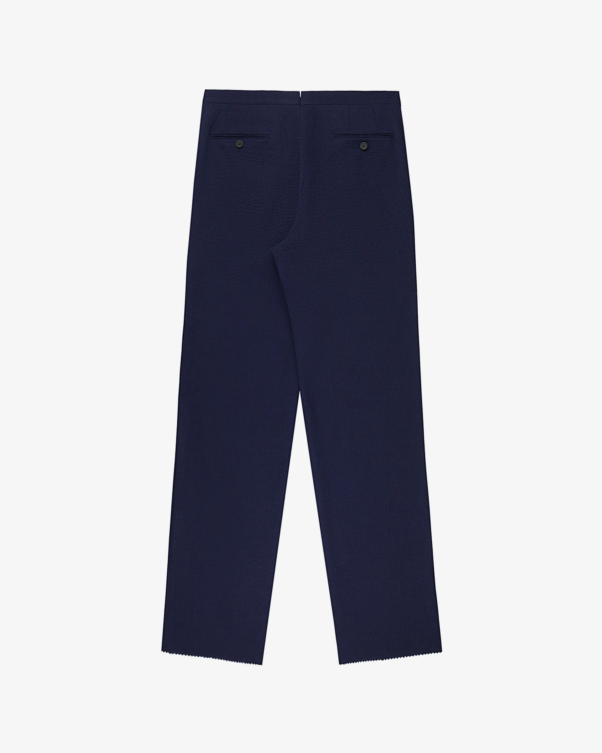 - • Navy suit trouser• Virgin wool seersucker fabric• Double pleats at front• Two darts at back• Regular fit• Hook & bar closure with zipper fly• Two on seam hand pockets• Two double besom pockets at back• Half lined• Unfinished hem meant to be tailored• Body: 100% Virgin Wool• Lining: 100% Cupro• Dry clean only• Made in USA