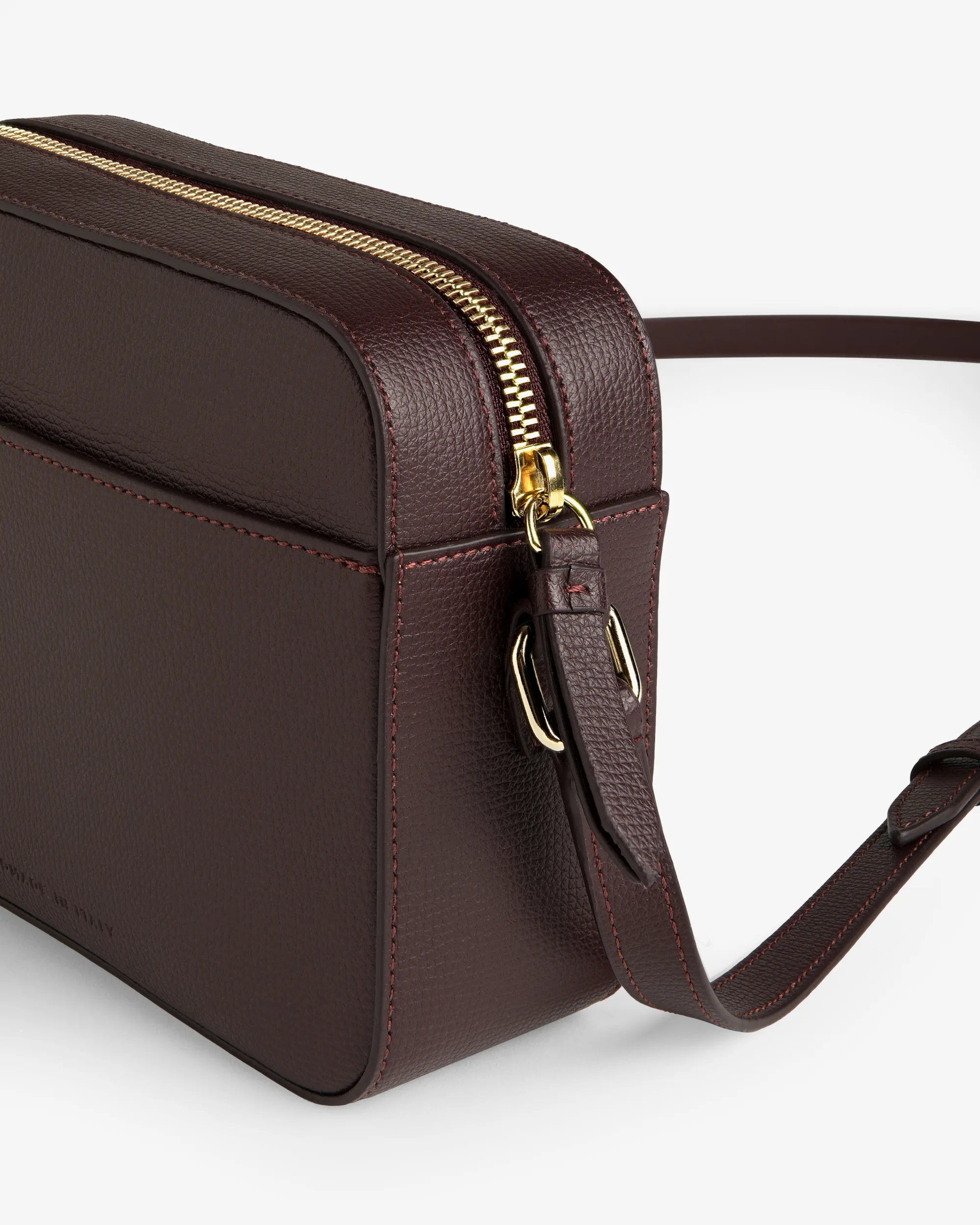 - • Burgundy bag• Full grain calf leather• Debossed gold foil logo at front• Large main compartment with zipper closure• Two slip pockets at interior• One slip pocket at exterior• Adjustable leather shoulder strap• Microfiber suede lining• Gold tone metal hardware• LWG certified Italian calf leather• Lining: 100% Microfiber Suede• Clean with soft dry cloth. Gently blot any liquid spills. If necessary, use a neutral leather cleaner or conditioner designed for aniline leathers. Avoid excessive exposure to sunlight, moisture, & heat. Store in a cool, dry place.• Made in Italy