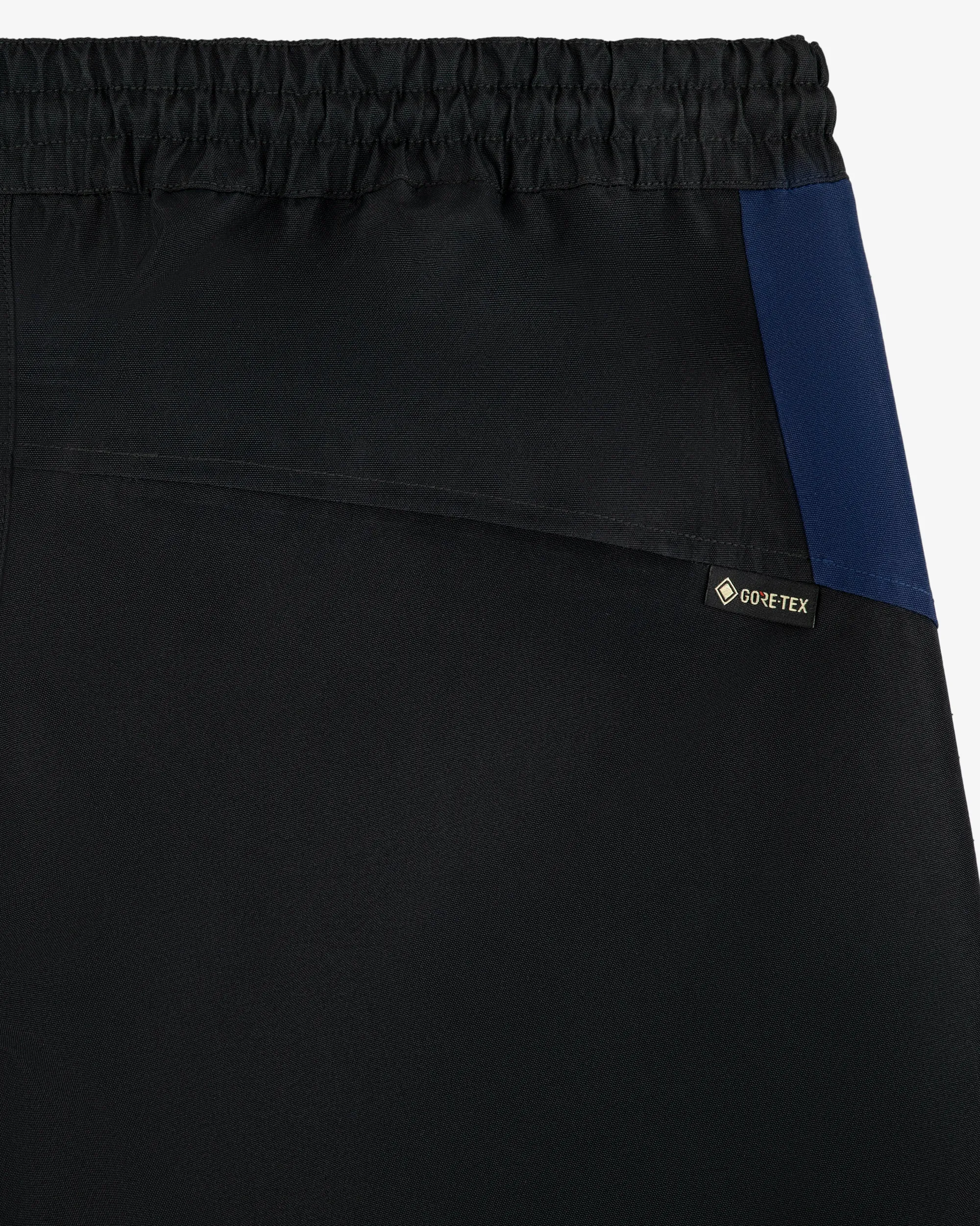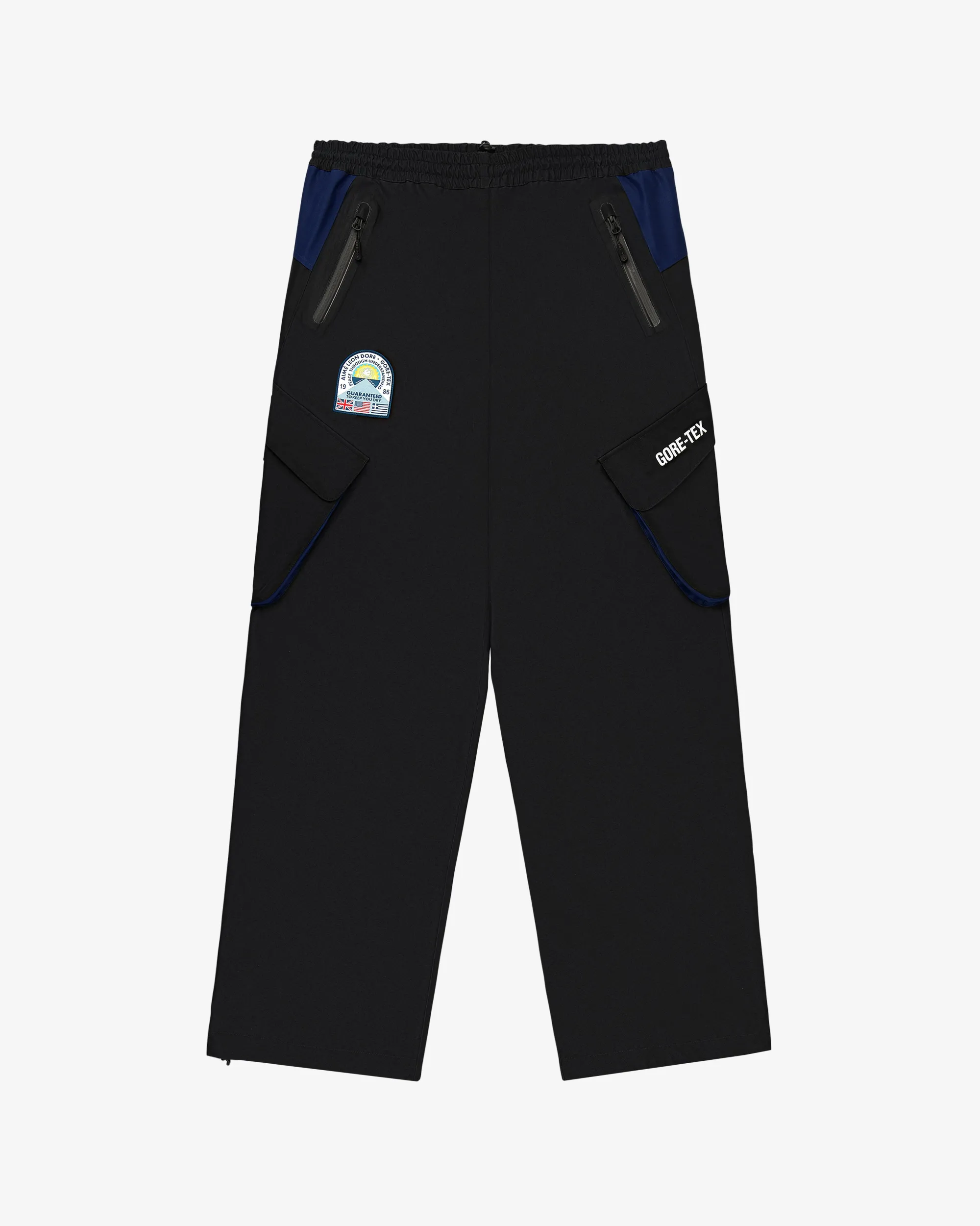 - • Black & navy pants• GORE-TEX waterproof fabric guaranteed to keep you dry• Applied Aimé Leon Dore & GORE-TEX patch at right thigh• Embroidered GORE-TEX logo at left thigh• Seal tape at seams• Regular fit• Elasticated waist with interior drawcord• Two hand pockets at front with zipper closure• Two zipper pockets at back• Two cargo pockets at sides• Body: 87% Polyester, 13% Polyurethane• Lining: 100% Nylon• Machine wash• Please note: The new ePE membrane technology is lighter and thinner, but just as strong and durable. While the outer fabric may dampen slightly faster, this does not compromise the garment’s waterproof performance. If you notice the fabric wetting out more quickly, simply wash and dry it to remove any oils and restore its water-repellent coating.• Made in China