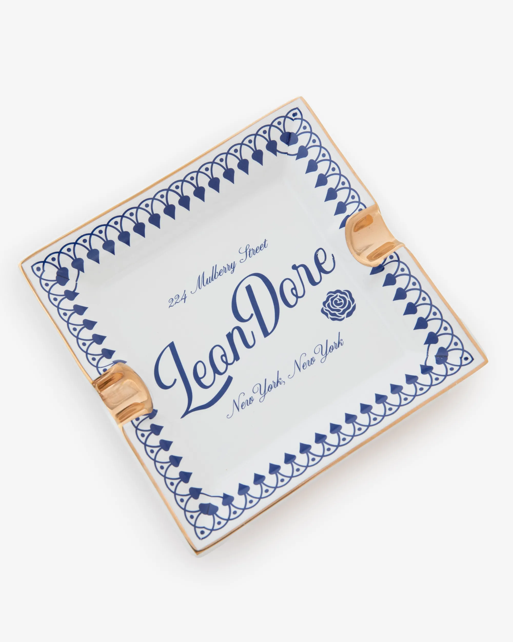 - • White & blue ashtray• Printed lounge graphic at front• Gold foil rim• Printed logo at back• 100% Ceramic• Wipe clean• Made in China