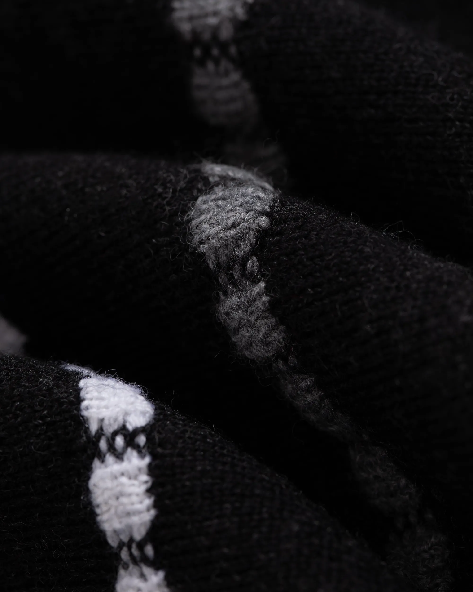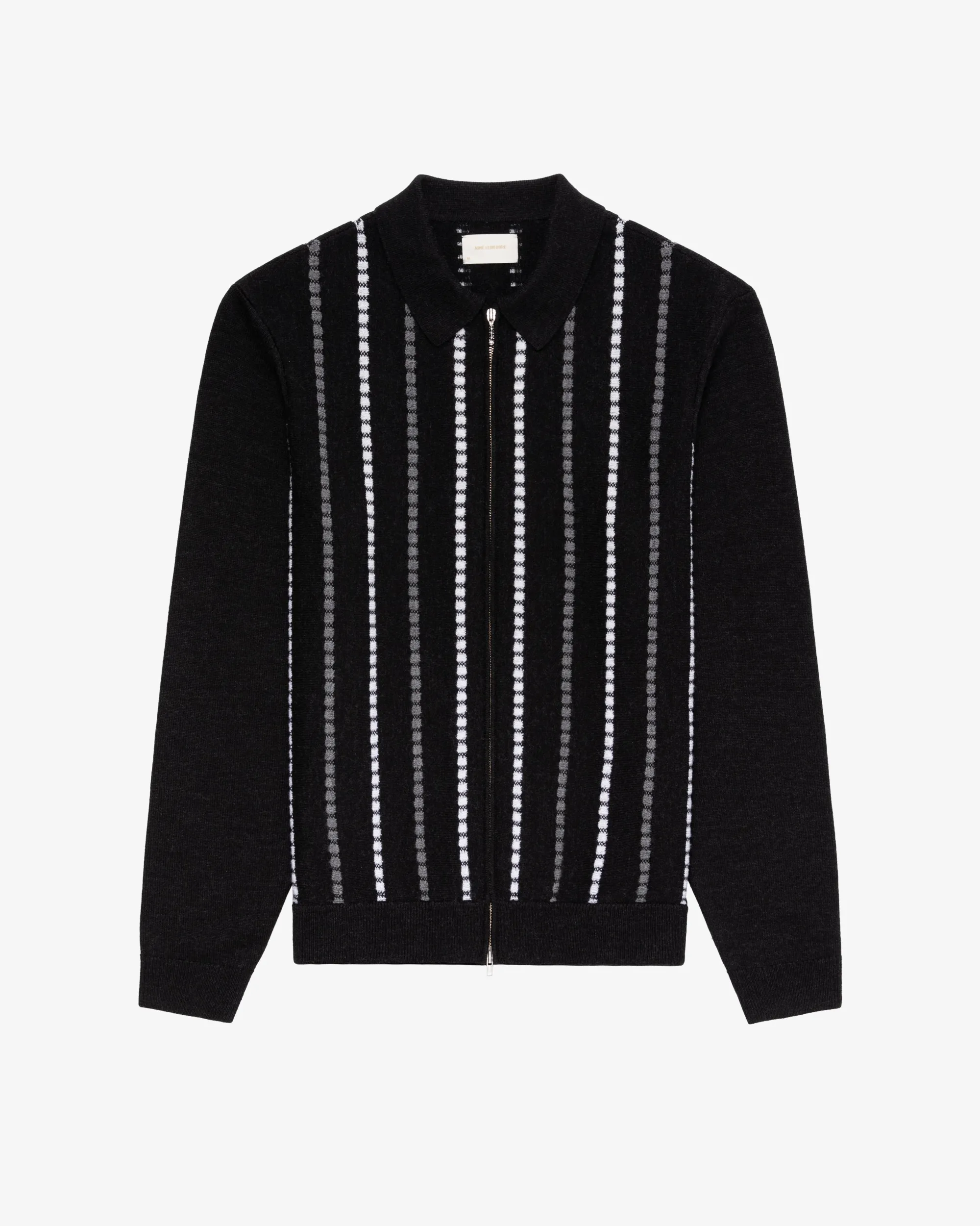 - • Black cardigan• Merino wool• Horizontal knit jacquard stripes at body• Regular fit• Zip closure at front• Ribbed collar, cuffs, & hem• 94% Merino Wool, 5% Nylon, 1% Elastane• Dry clean only• Made in China