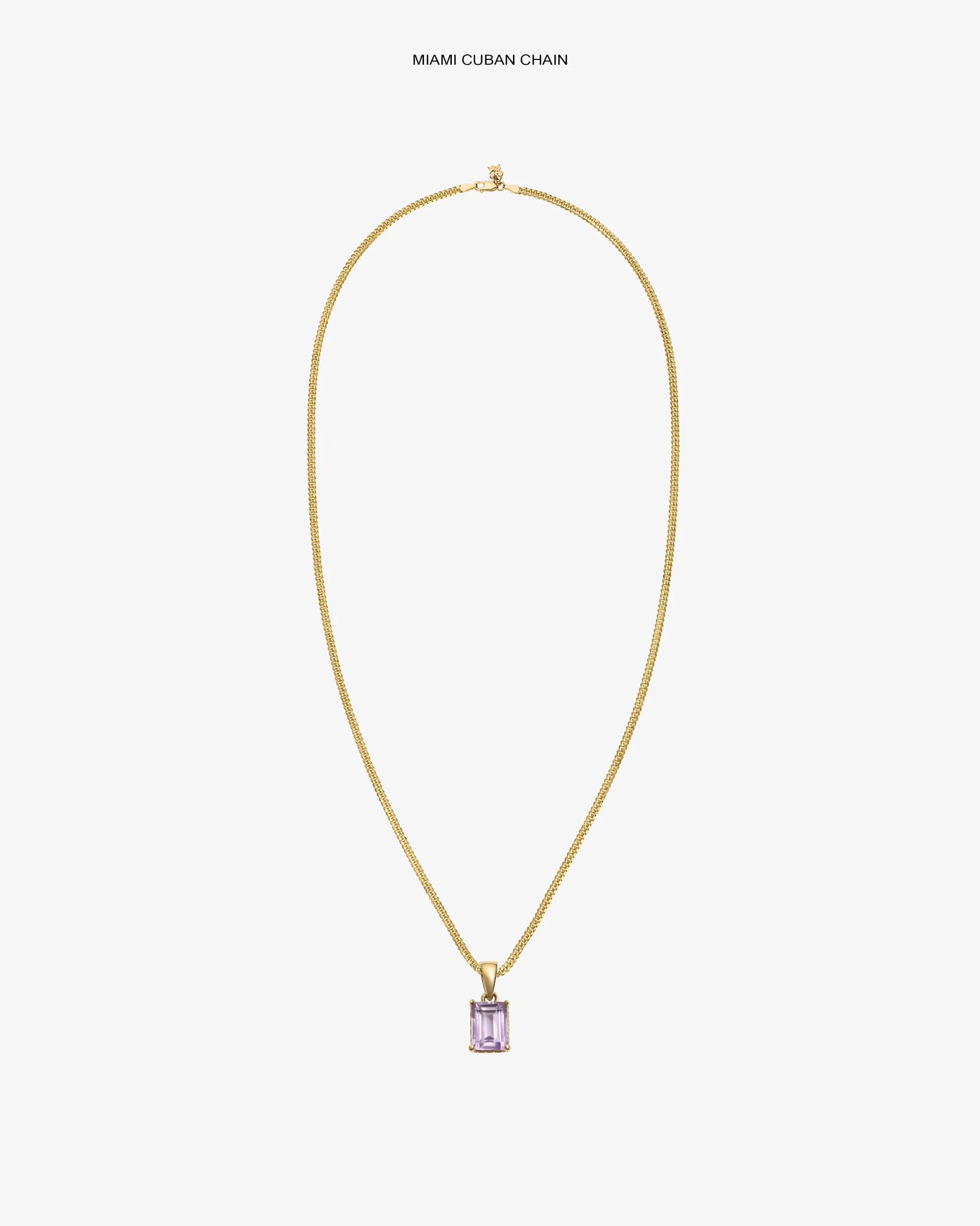 - • Gold & amethyst pendant• Solid 14Kt gold base with emerald cut amethyst stone• Base: 14Kt gold• Stone: Natural Amethyst• Professional clean only• Handmade in NYC• Note: Due to the handmade nature of the product, size may vary slightly resulting in differences that are unique to each piece.