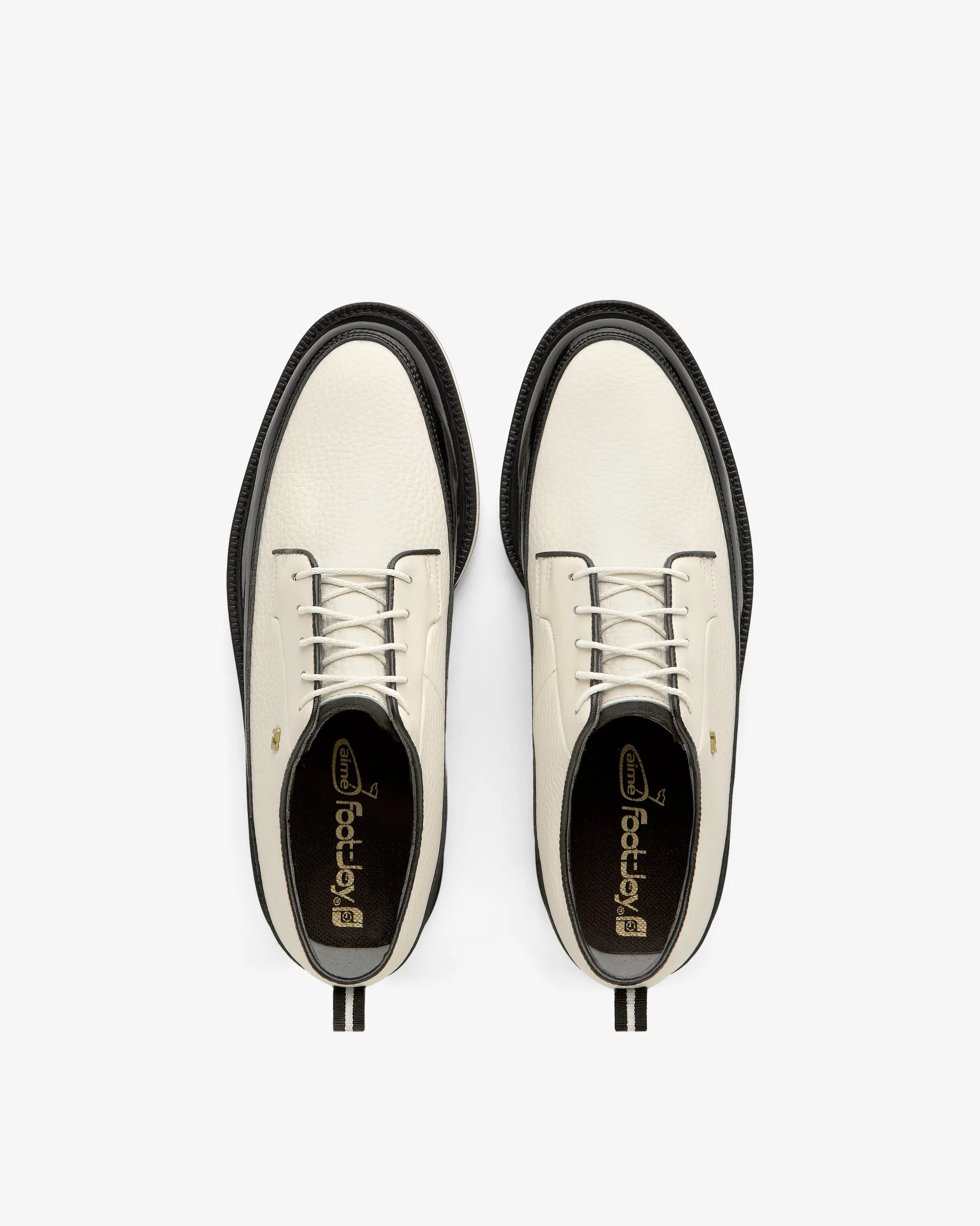 - • White & black• Hand-selected premium full-grain leather• VersaTrax+ Outsole Technology with Renewable Pulsar LP Cleats by SoftSpikes® for multi-directional traction & stability for all surfaces• 360° traction creates impermeable defense against swing forces• Supportive EVA Midsole with Performance Cushioning• All-Day Underfoot Comfort from an OrthoLite® EcoPlush FitBed®• Enhanced collar padding & lambskin lining for improved comfort• Custom co-branded ALD Golf & FootJoy sockliner• LifeShield Waterproof Technology• Pre-Round Care: Use a shoe horn when putting on your golf shoes to protect the heel counter.• Post-Round Shoe Cleaning & Care: Clean leather upper after each round to remove dirt with a white shoe cleaner. Allow to air dry at room temperature.• If your shoes become soaked during a round, clean them quickly. Place crumpled newspaper inside for 8-10 hours to absorb excess water. Remove newspaper and replace with FootJoy Cedar Shoe Trees to bring upper back to normal shape, smooth lining, & absorb any remaining water & odor.• Remove laces & inner sole for cleaning• Do not store your shoes in direct sunlight or high temperatures.• Made in Vietnam
