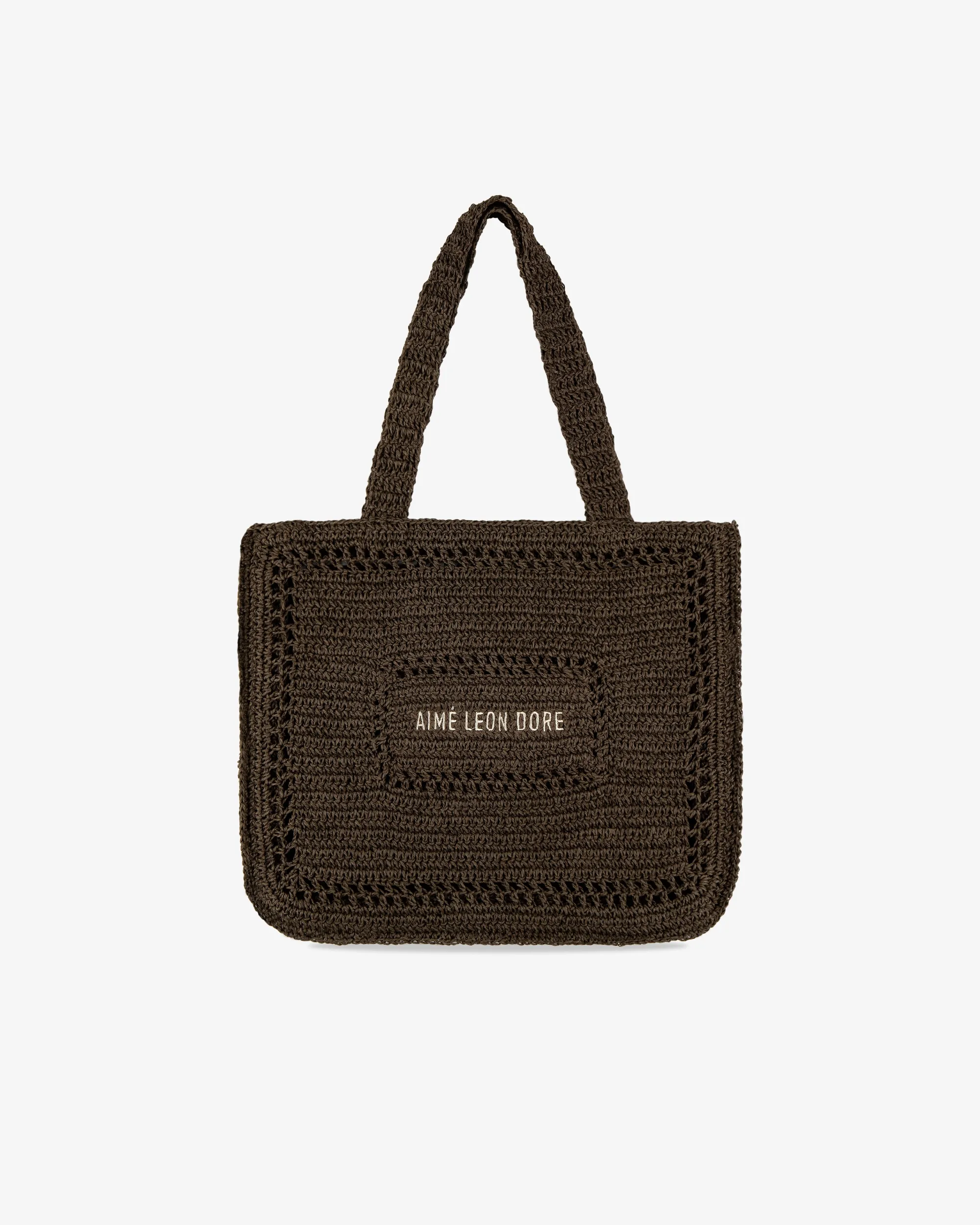 - • Brown crochet tote• Natural raffia• Embroidered logo at front• 100% Raffia Straw• Professional clean only• Made in China