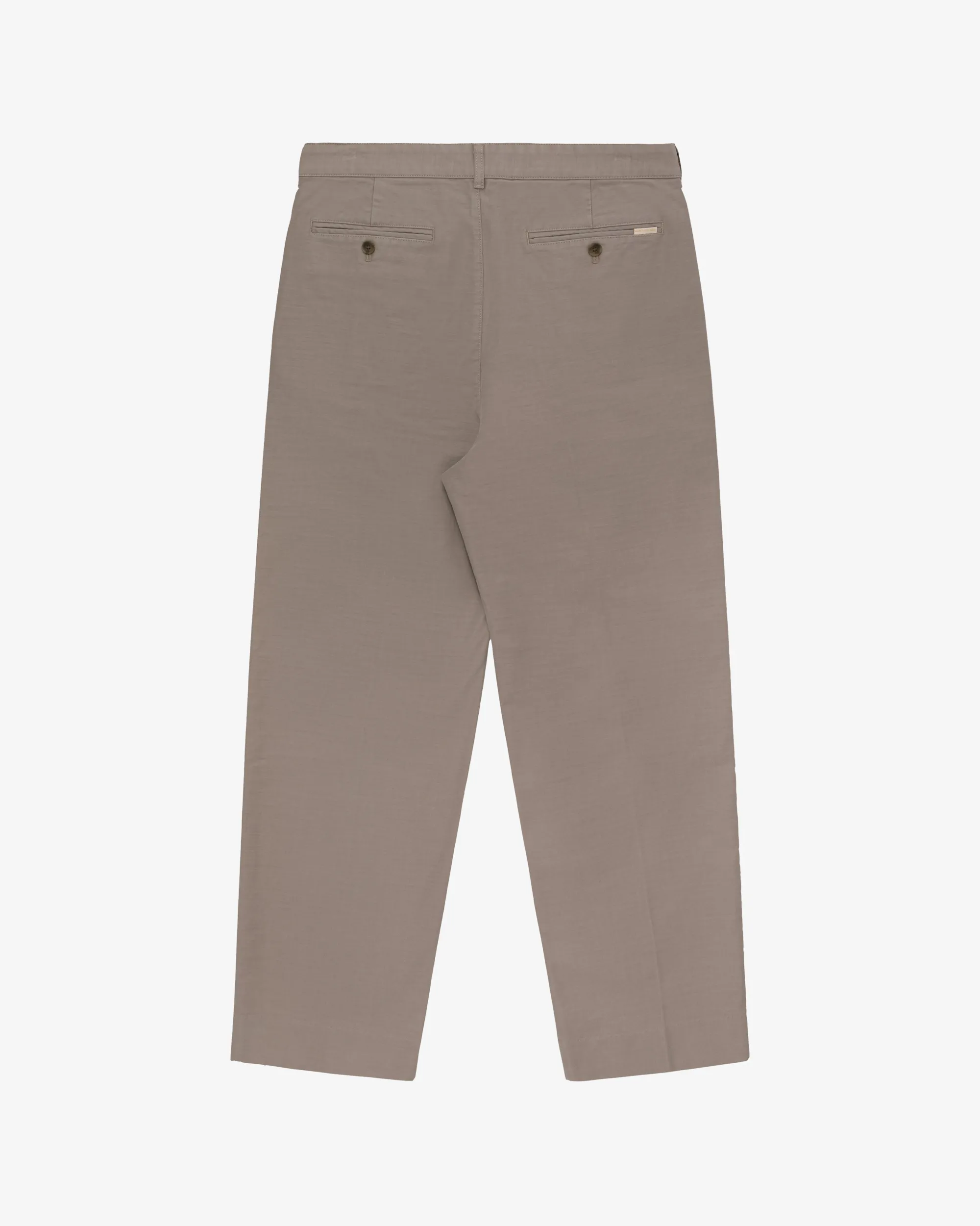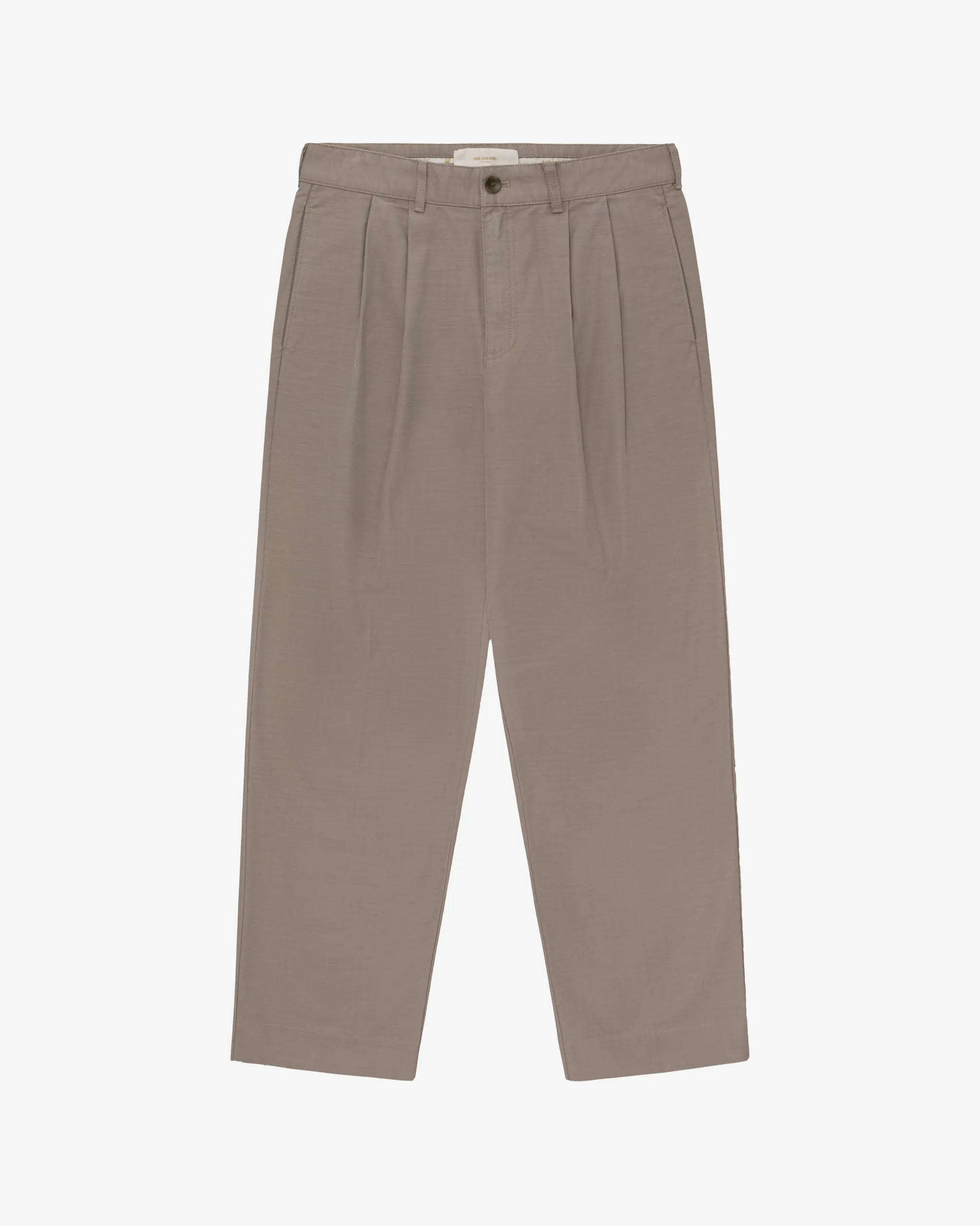 - • Taupe pants• Garment washed cotton fabric• Double pleats at front• Fixed waistband with belt loops• Straight fit• Button closure with zipper fly• Two hand pockets at side seams• Two double welt pockets at back with button closure• 100% Cotton• Machine wash• Made in China