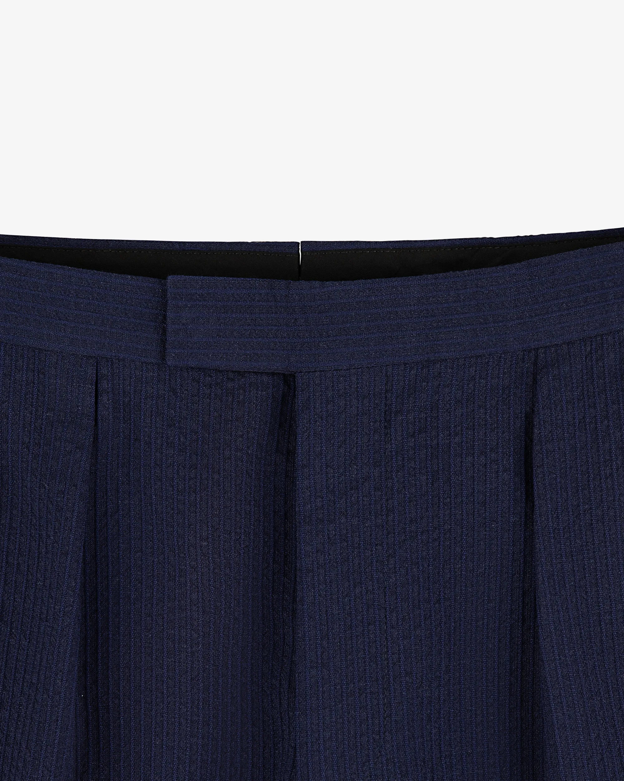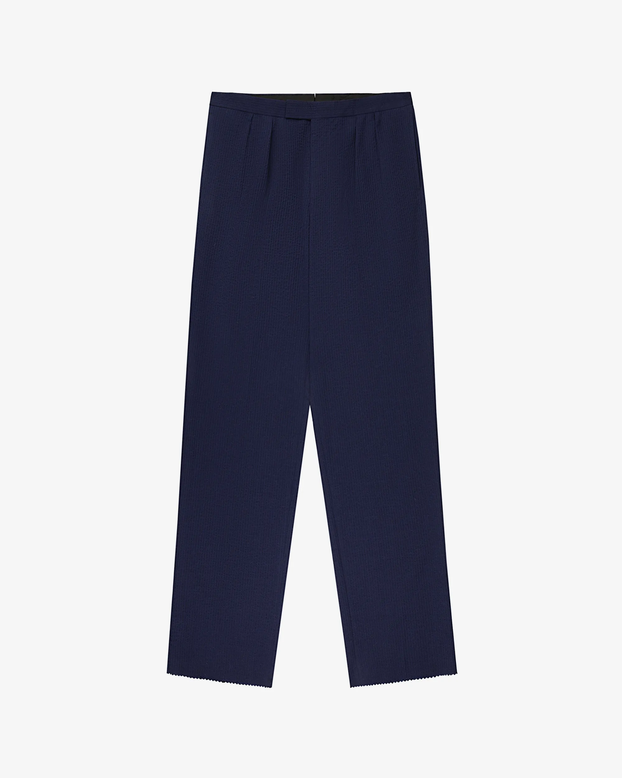 - • Navy suit trouser• Virgin wool seersucker fabric• Double pleats at front• Two darts at back• Regular fit• Hook & bar closure with zipper fly• Two on seam hand pockets• Two double besom pockets at back• Half lined• Unfinished hem meant to be tailored• Body: 100% Virgin Wool• Lining: 100% Cupro• Dry clean only• Made in USA