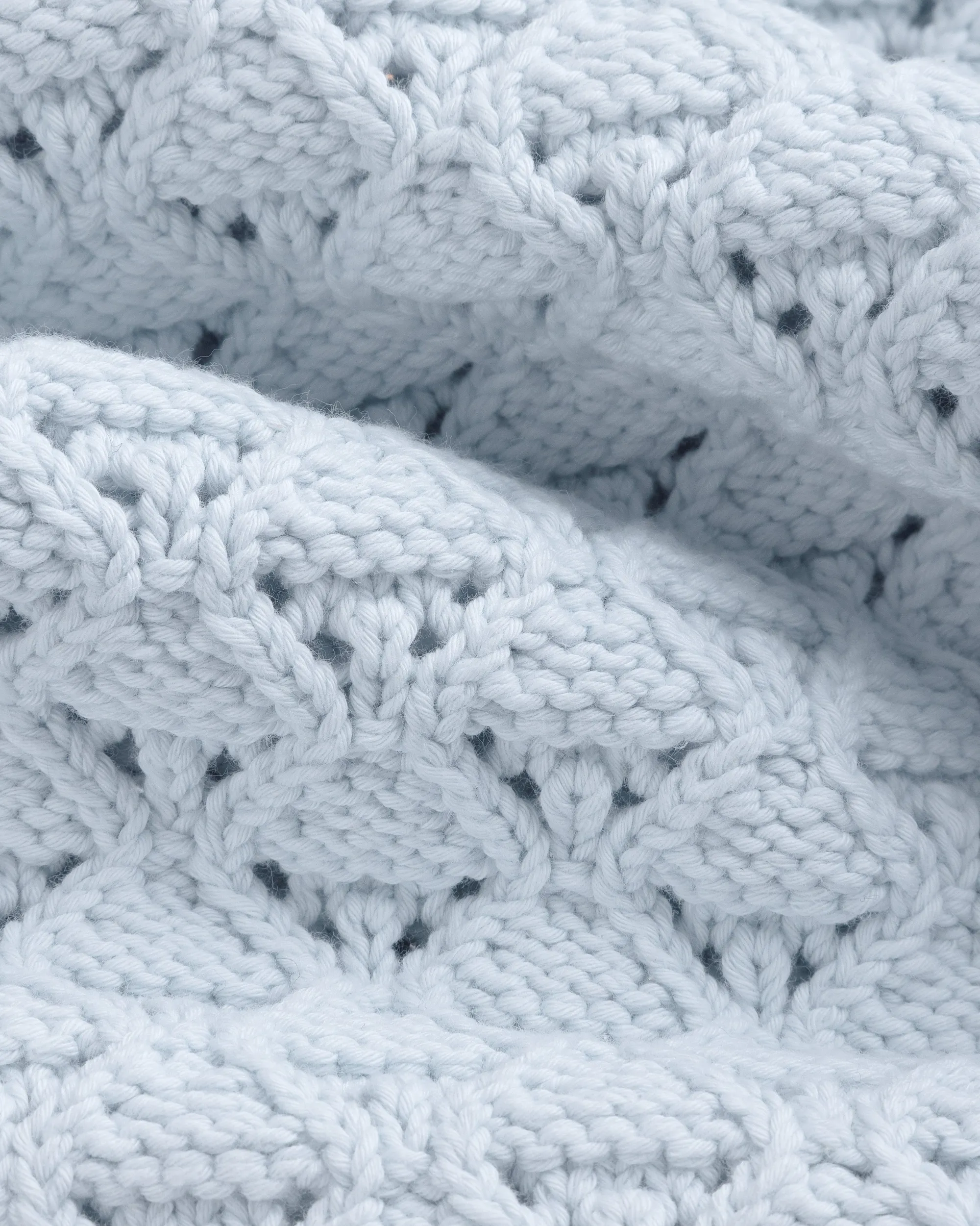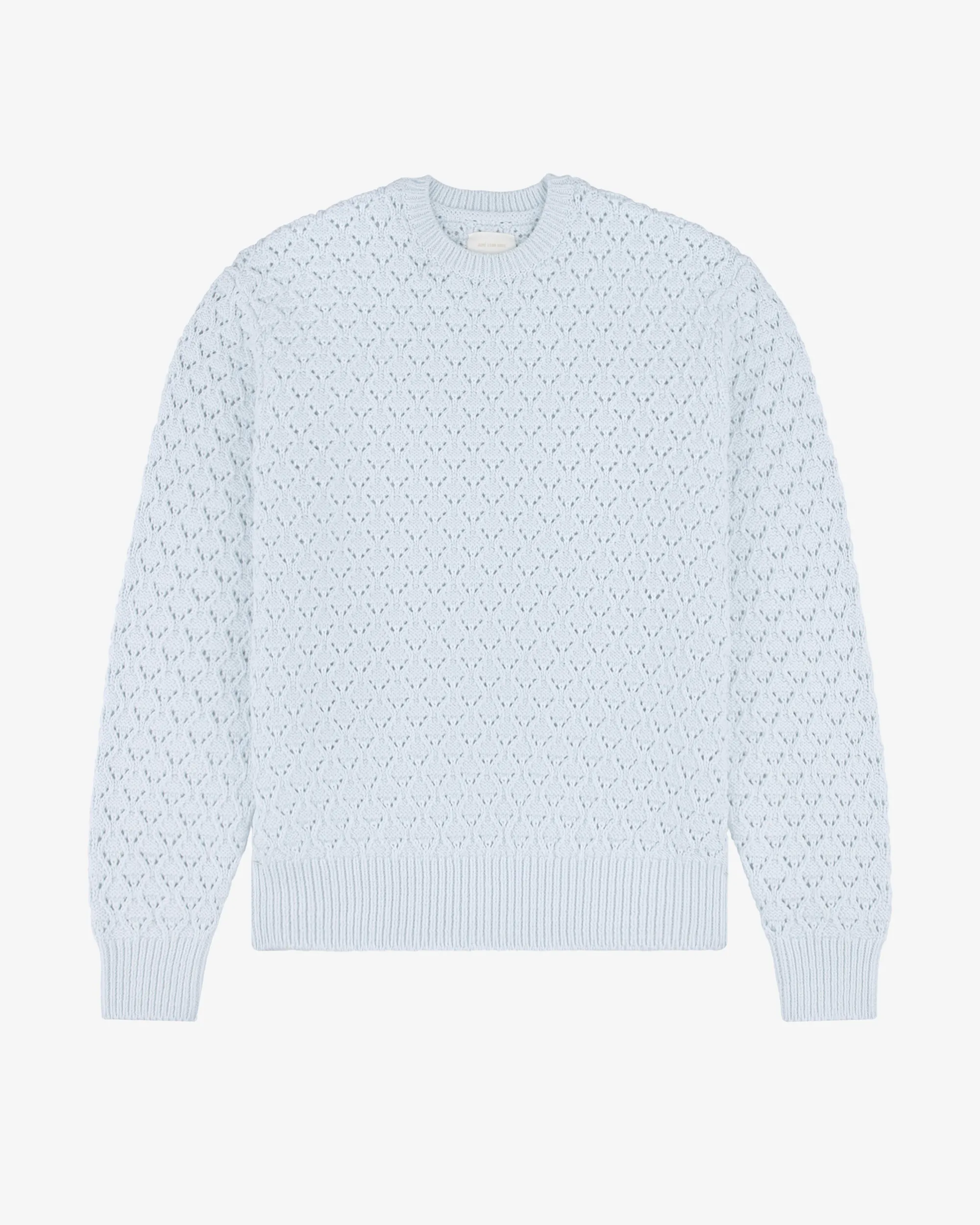 - • Light blue crewneck sweater• Jacquard eyelet knit throughout• Regular fit• Ribbed collar, cuffs, & hem• 98% Cotton, 1% Nylon, 1% Elastane• Dry clean only• Made in China