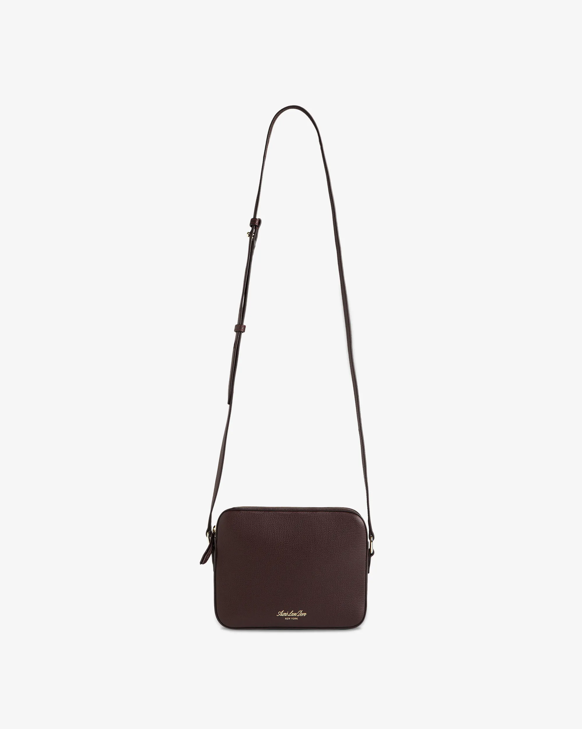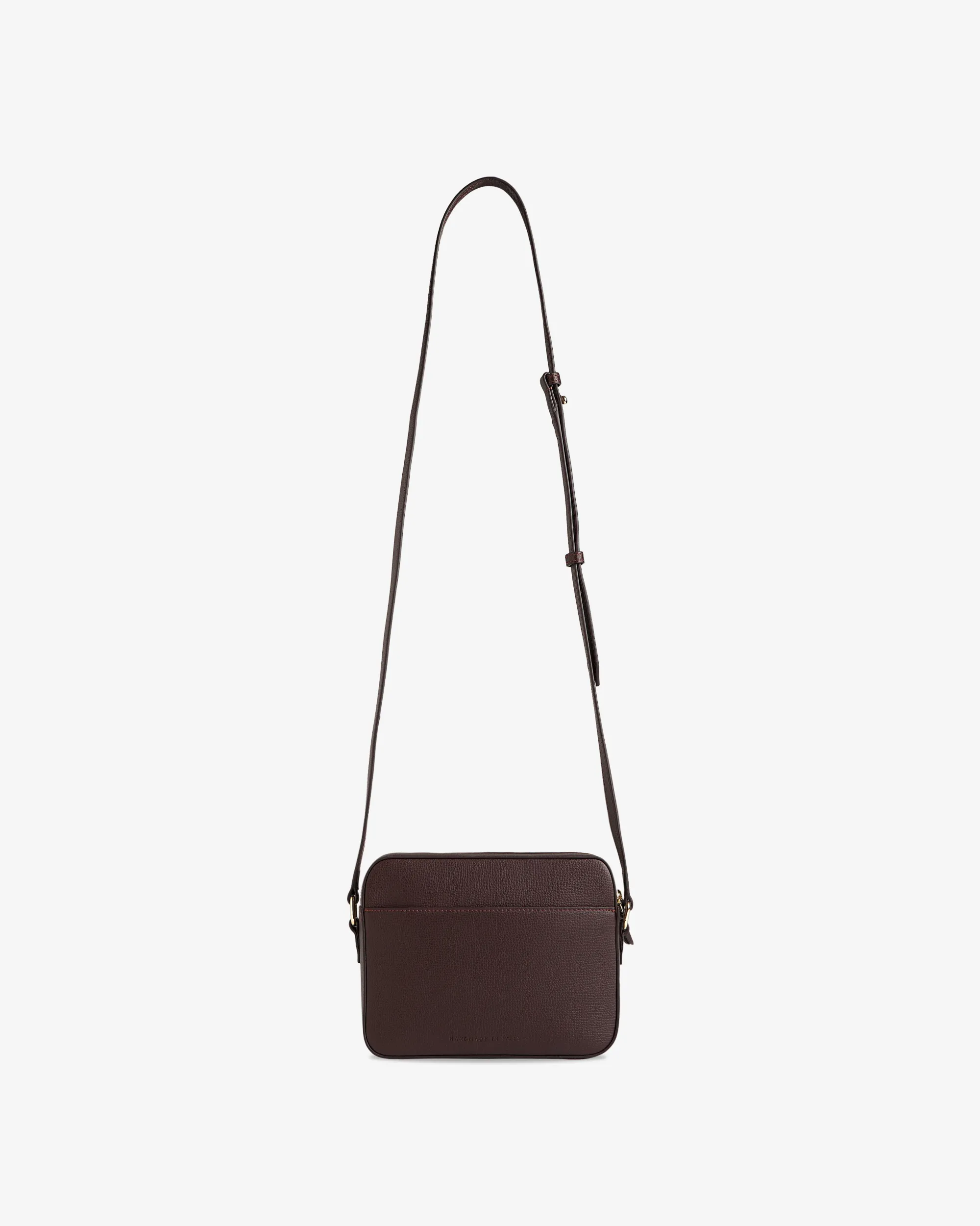 - • Burgundy bag• Full grain calf leather• Debossed gold foil logo at front• Large main compartment with zipper closure• Two slip pockets at interior• One slip pocket at exterior• Adjustable leather shoulder strap• Microfiber suede lining• Gold tone metal hardware• LWG certified Italian calf leather• Lining: 100% Microfiber Suede• Clean with soft dry cloth. Gently blot any liquid spills. If necessary, use a neutral leather cleaner or conditioner designed for aniline leathers. Avoid excessive exposure to sunlight, moisture, & heat. Store in a cool, dry place.• Made in Italy