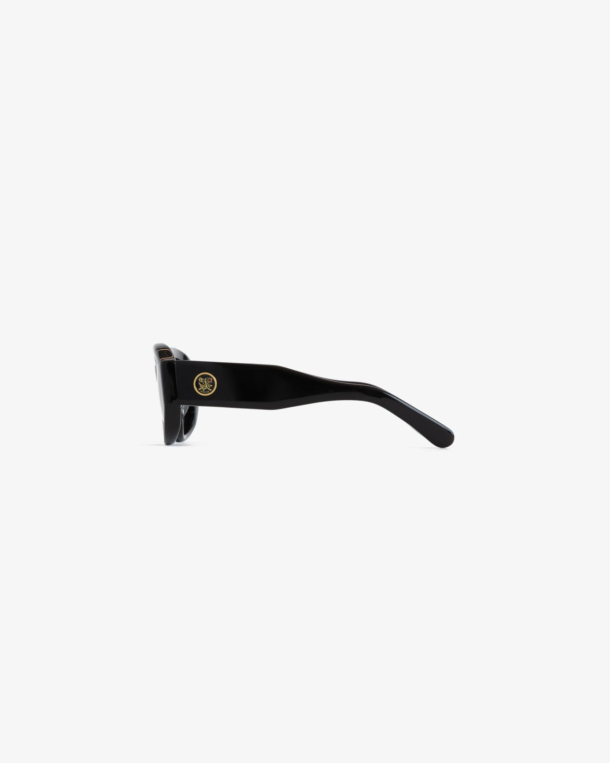 - • Black sunglasses• Black tinted lenses• Engraved logo at lens• Gold enamel floral crest logo with ruby detail at temples• Includes gold logo printed leather case• 100% UVA/UVB protection• 100% Acetate• Wipe clean• Made in Japan