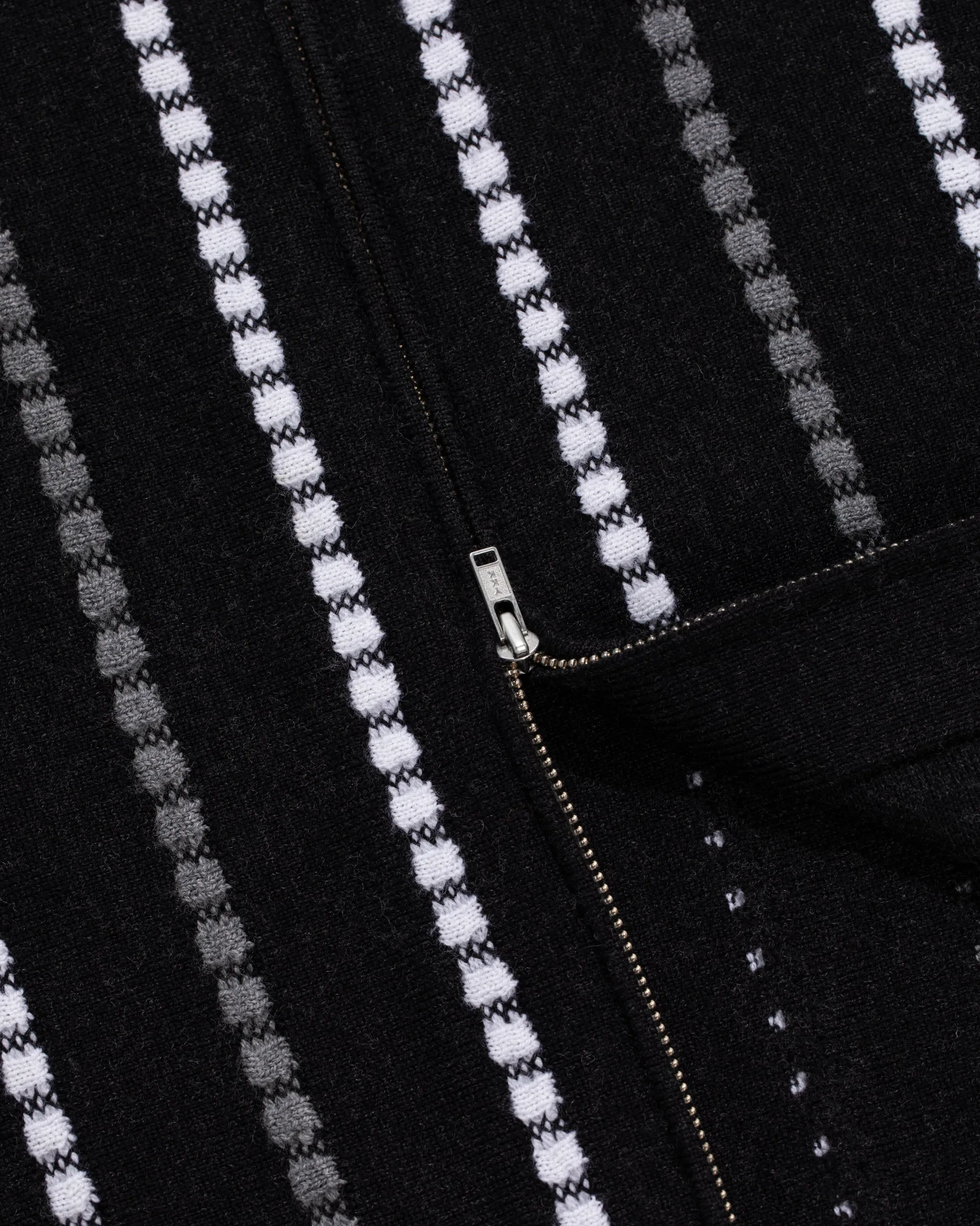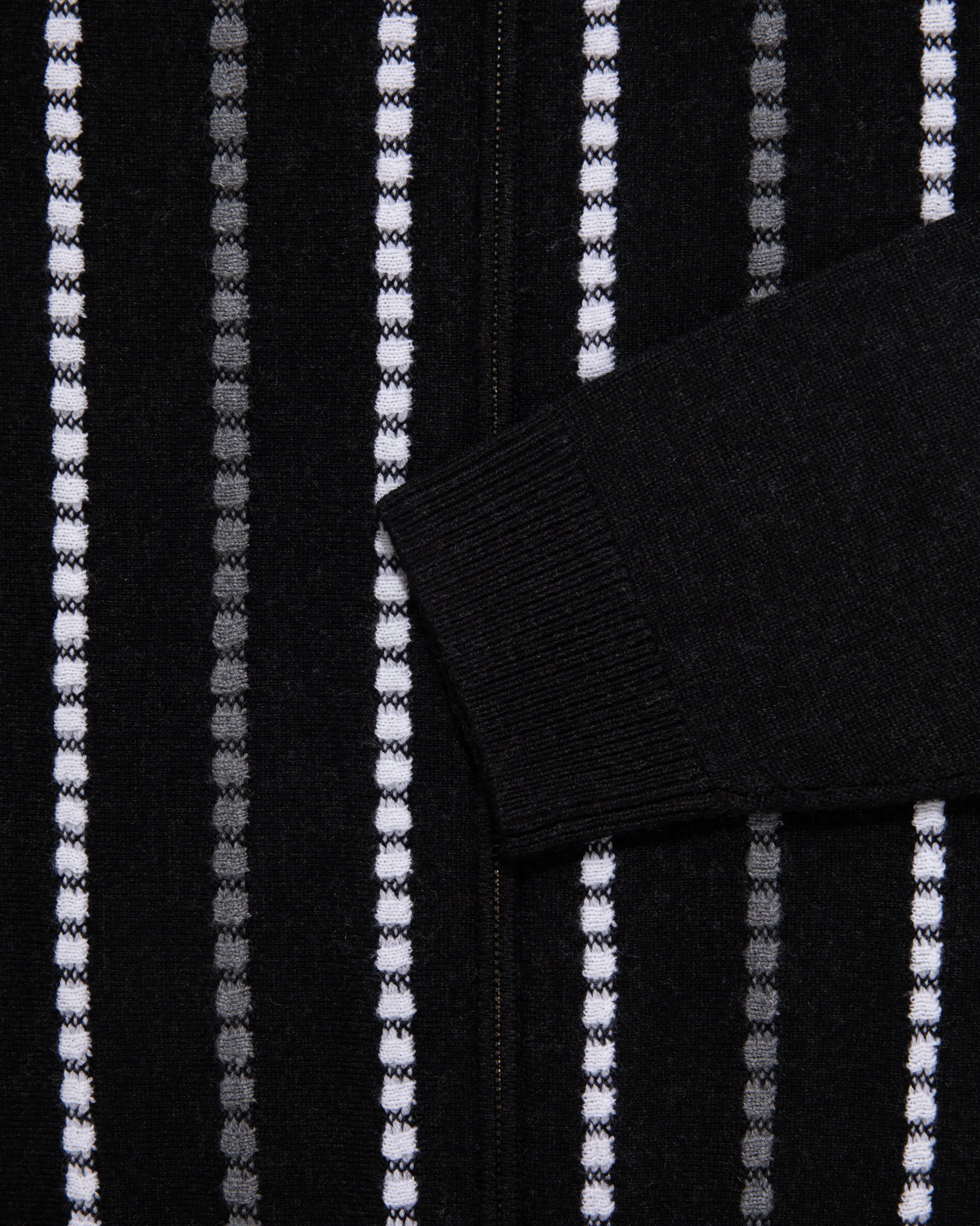 - • Black cardigan• Merino wool• Horizontal knit jacquard stripes at body• Regular fit• Zip closure at front• Ribbed collar, cuffs, & hem• 94% Merino Wool, 5% Nylon, 1% Elastane• Dry clean only• Made in China