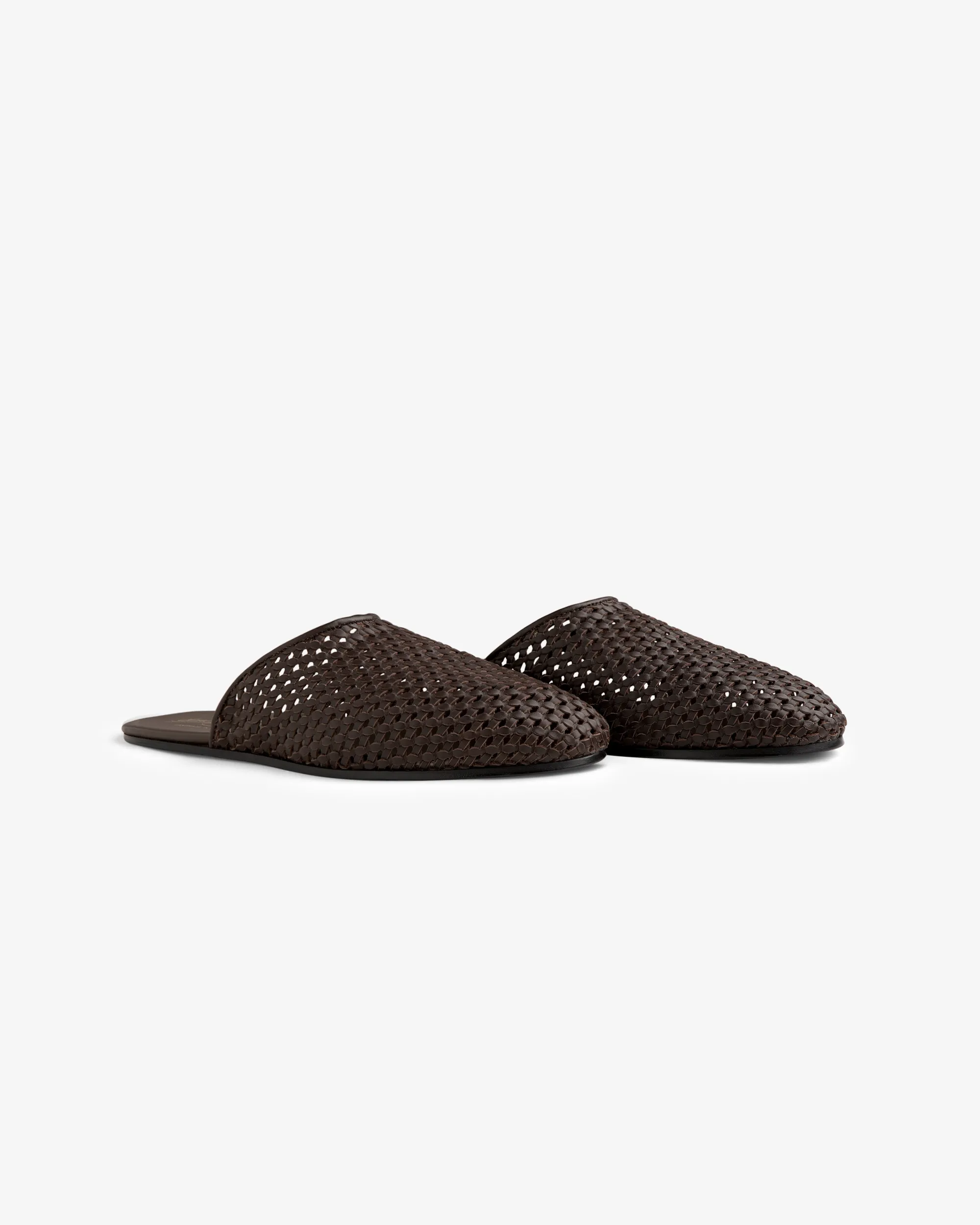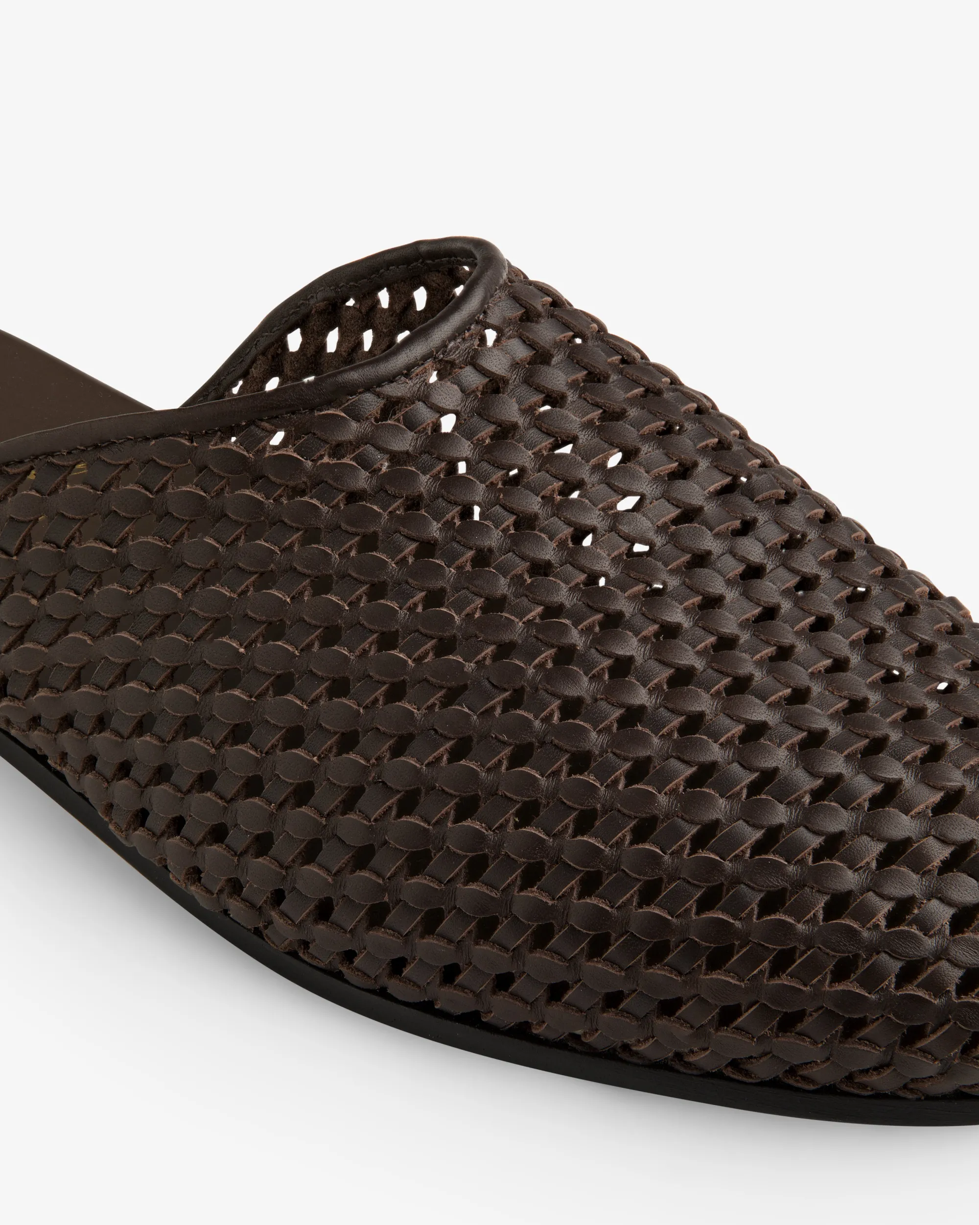 - • Brown leather mule• Hand woven leather raffia upper• Calfskin footbed lining with gold printed logo• Single stack leather sole with debossed logo• Rubber finish at heel• Upper: 100% Leather• Sole: 90% Leather, 10% Polyurethane Foam• Spot clean with dry cloth• Made in Italy• Note: This type of leather is not water-resistant and is prone to staining & discoloration. Store in a cool, dry place.