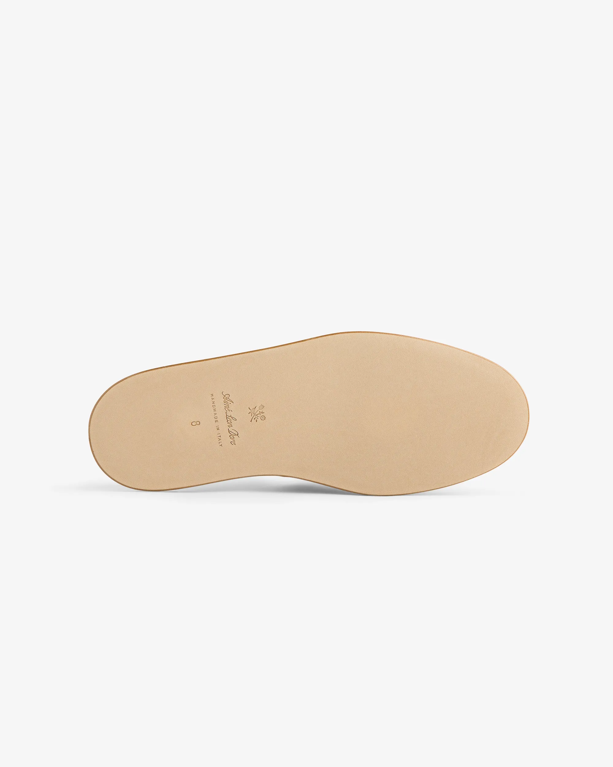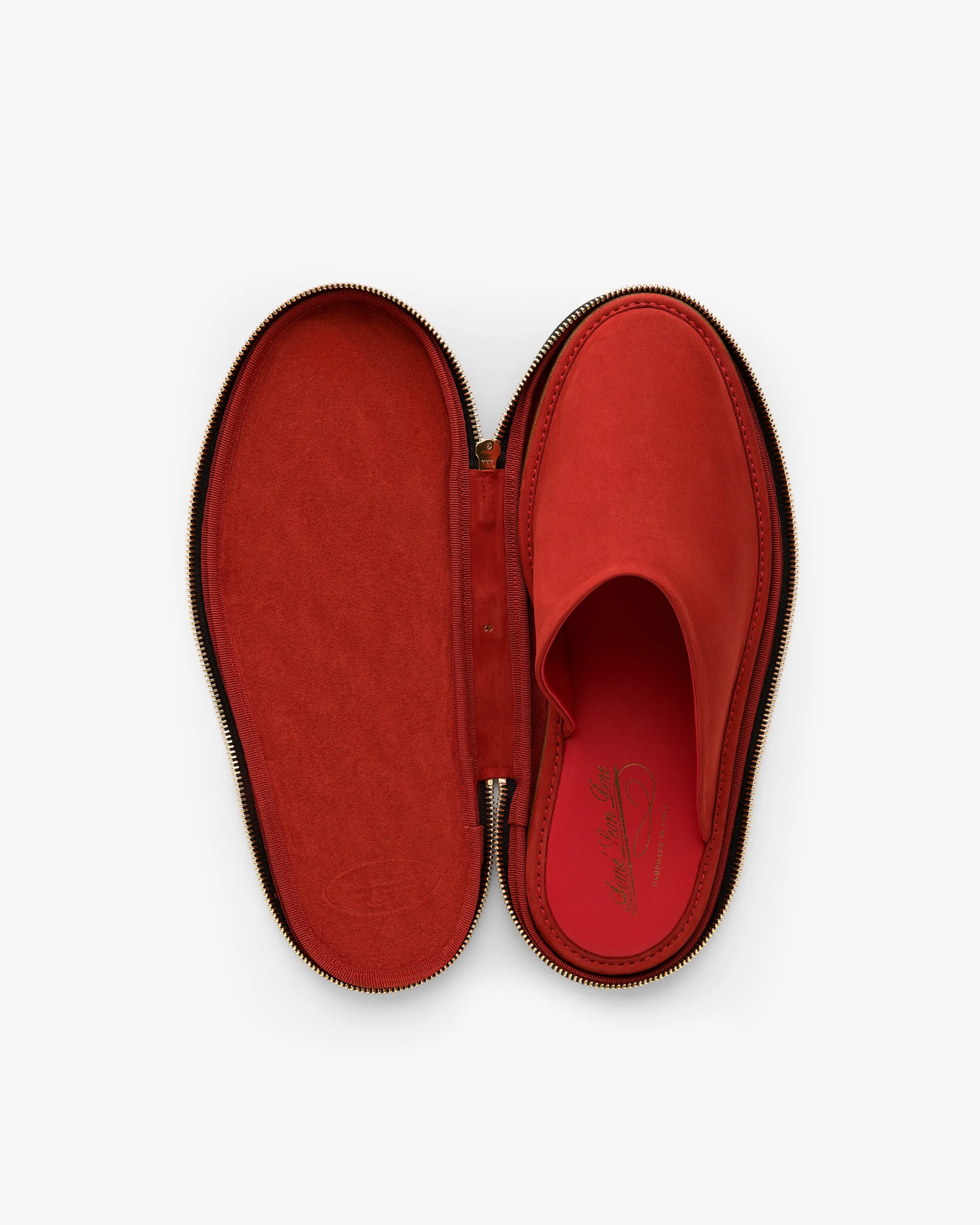 - • Red suede slipper• Premium Italian nubuck leather• Calfskin lining with gold printed logo• Single stack sueded leather outsole with debossed logo• Includes branded premium leather traveling case• Suitable for indoor & outdoor use• LWG certified Italian leather• Spot clean with dry cloth• Made in Italy• Note: This type of leather is not water-resistant and is prone to staining and discoloration. Store in a cool, dry place. Remove protective film from outsole before use.