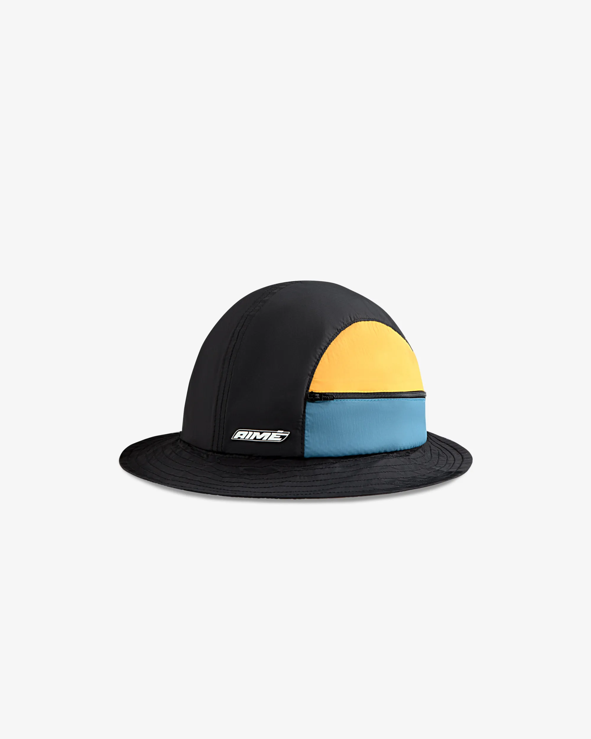 - • Black bucket hat• Lightweight nylon fabric• Contrast colorblock panel at side• Aimé sport logo at front• One zipper pocket at side• Stitched eyelets• 100% Nylon• Hand wash• Made in China