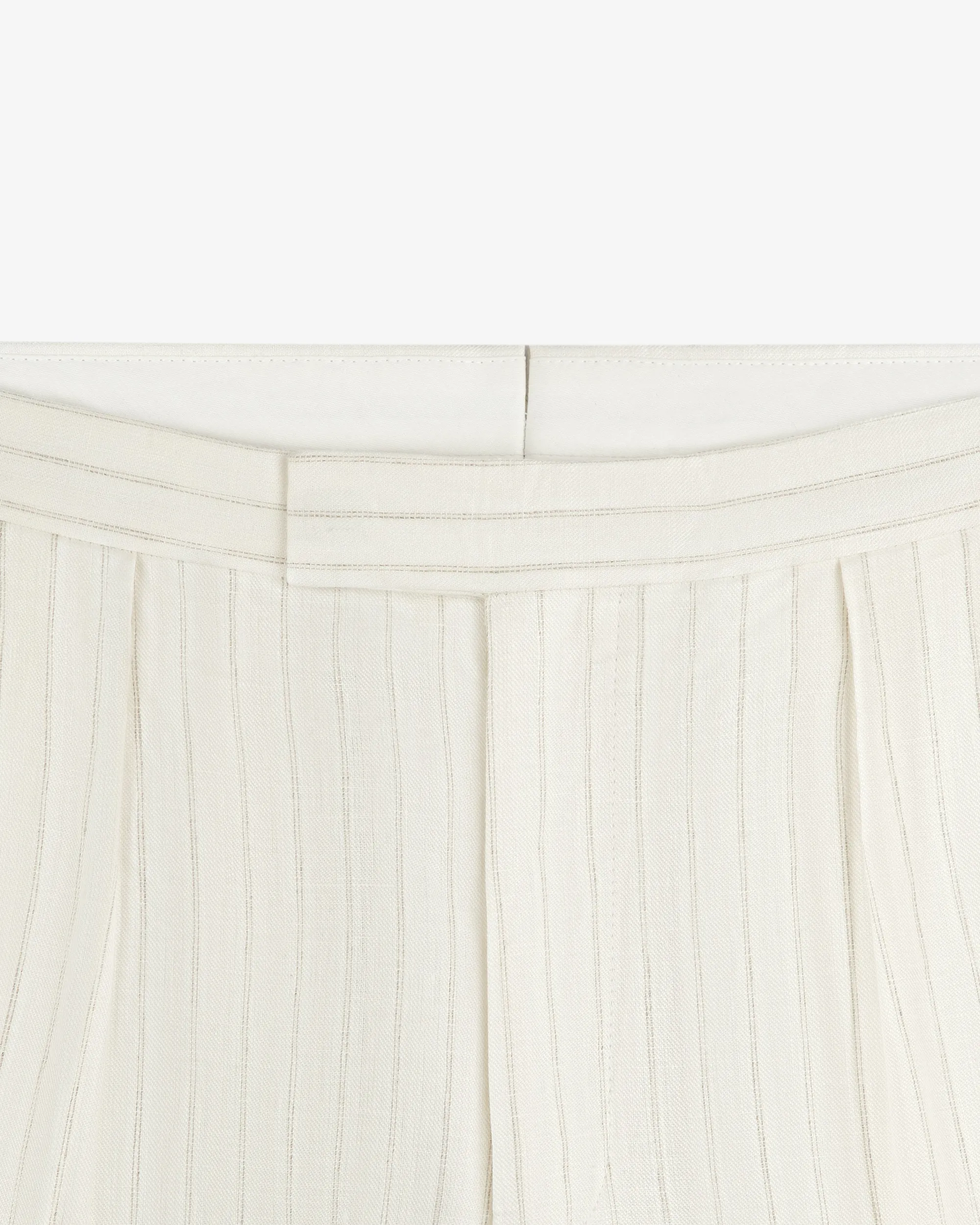 - • Cream linen suit trouser• Double pleated body• Two darts at back• Straight fit• Hook & bar closure with zipper fly• Two hand pockets at side seam• Two welt pockets at back with button closure• Unlined• Unfinished hem meant to be tailored• 100% Linen• Dry clean only• Made in USA